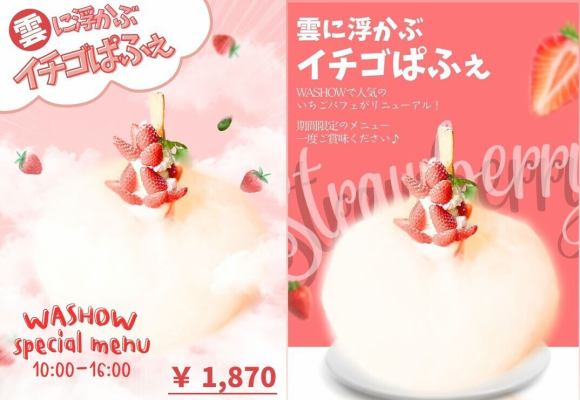 綿菓子をまとって雲に浮かぶような、新しいスタイルのWASHOWいちごパフェです。